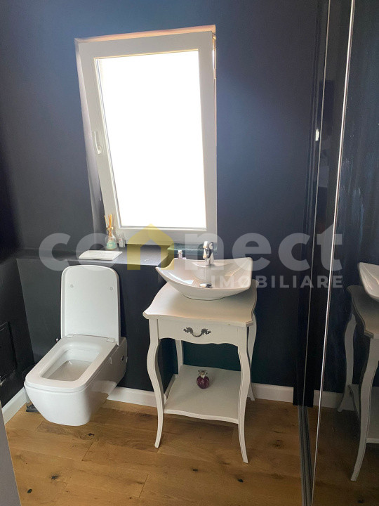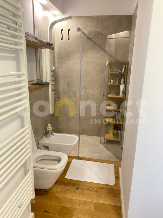 Baie matrimoniala: lavoar cu baterie cu senzor, vas wc, vas bideu, cabina dus, geam.