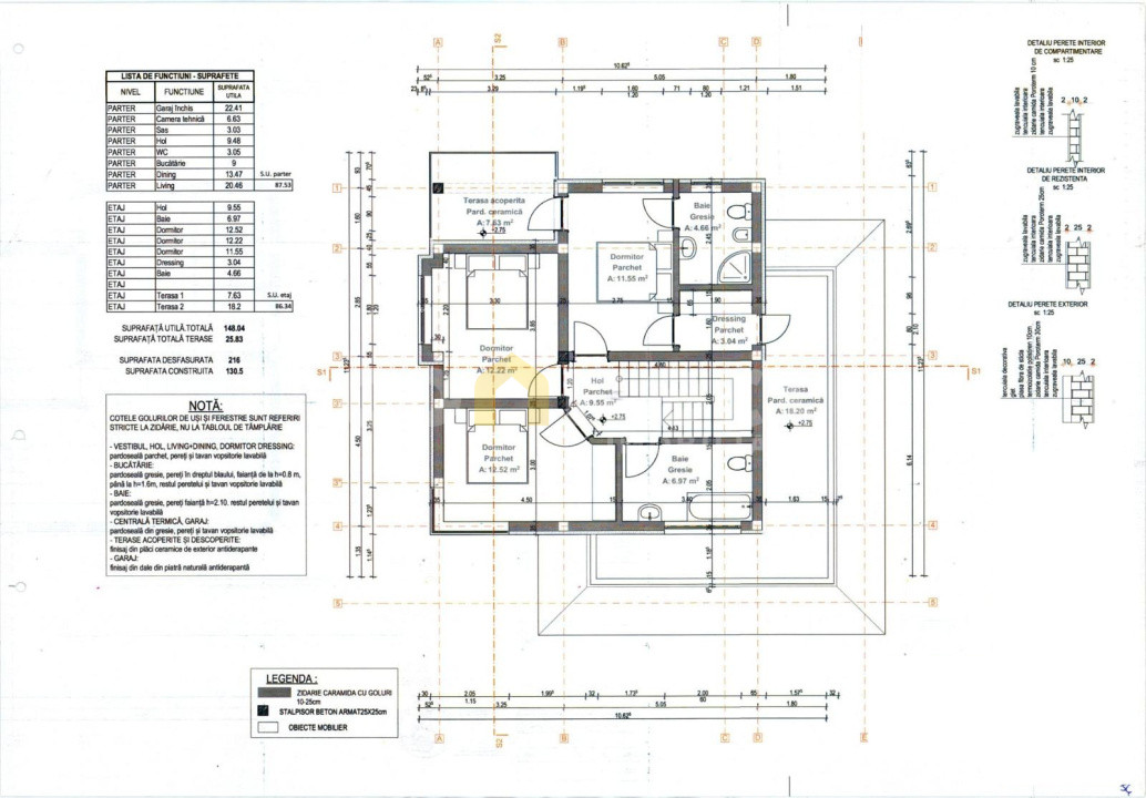 Suprafața totală a terenului este 1000 mp, iar amprenta la sol a casei este 130.5 mp.