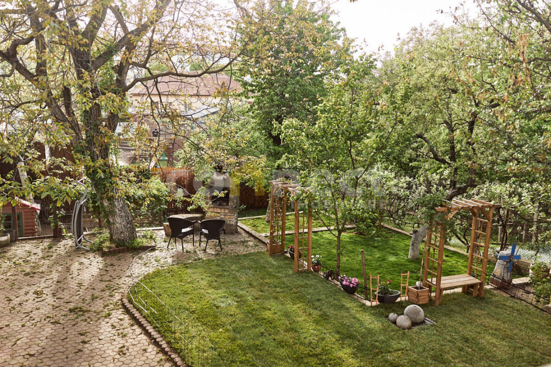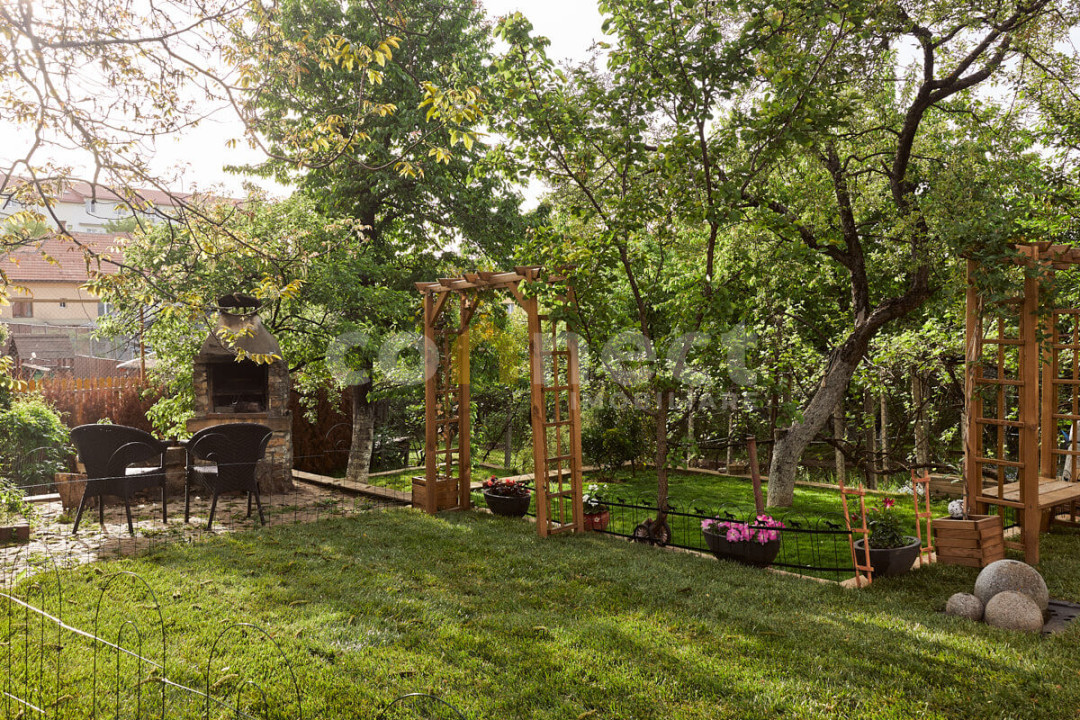 Terenul aferent este impartit intre curte si gradina, carora li s-a acordat aceeasi atentie deosebita. Pomii fructiferi, plantele perene, arbustii, tufele de trandafiri isi au fiecare locul lor si incanta privirea.