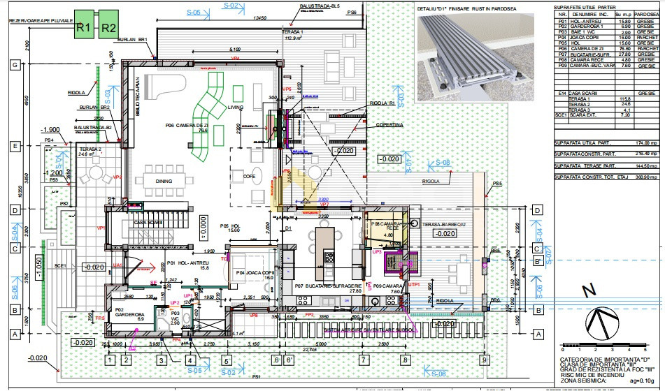 Rezervoare subterane pentru colectare apă (5.500L) și stație de epurare Valrom (1.33 mc/zi).