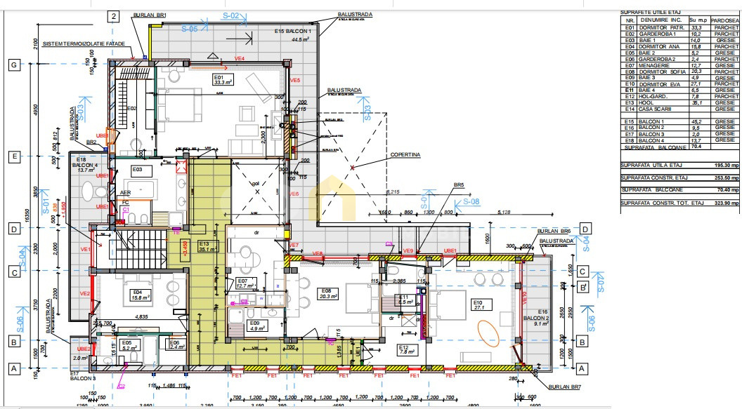 * Etaj 1: 4 dormitoare separte cu baie proprie si dressing integrat, spatiu de spalatorie/urcatorie - acces catre un balcon circular