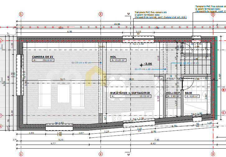 -- parter cu living, bucătărie + loc de luat masa, baie, spațiu pentru depozitare