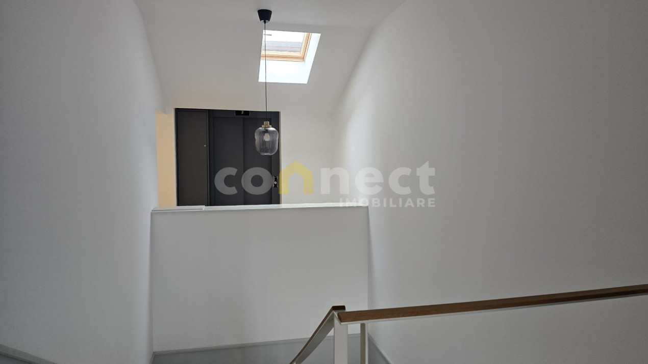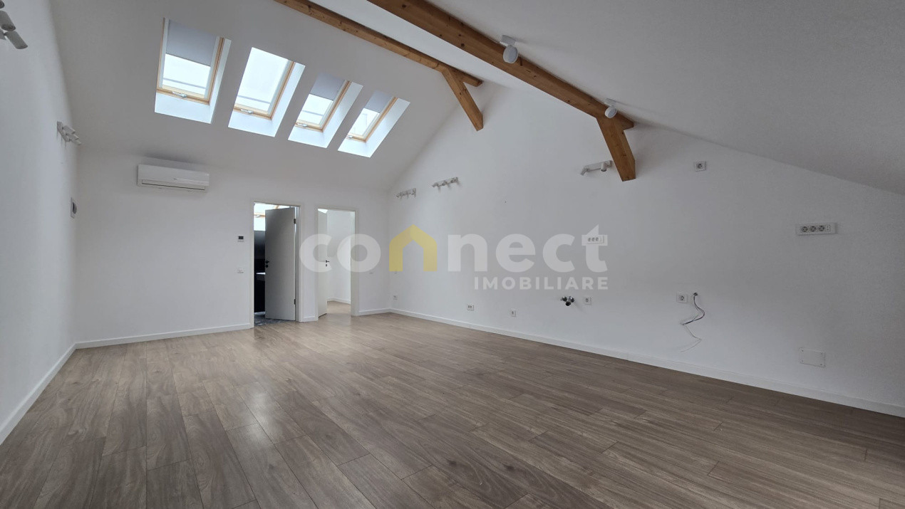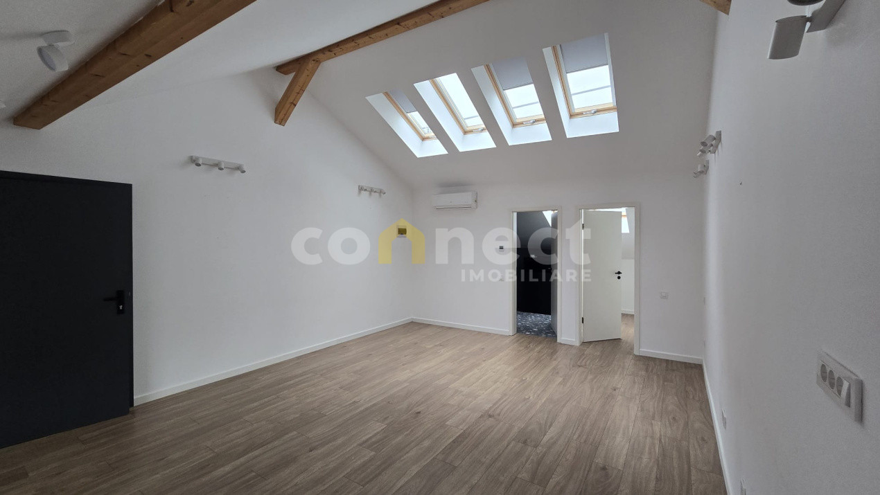 Spatiul e inalt, are o zona deschisa si un spatiu pentru depozitare - cu velux; are zona pt kitcineta.